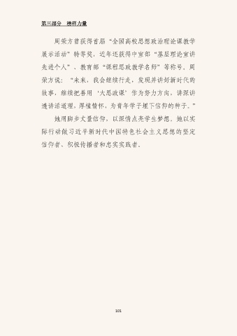 第三部分 榜样力量 周荣方曾获得首届“全国高校思想政治理论课教学 展示活动”特等奖,近年还获得中宣部“基层理论宣讲 先进个人”、教育部“课程思政教学名师”等称号。周 荣方说:“未来,我会继续行走,发现并讲好新时代的 故事,继续把善用‘大思政课’作为努力方向,讲深讲 透讲活道理,厚植情怀,为青年学子埋下信仰的种子。” 她用脚步丈量信仰,以深情点亮学生梦想。她以实 际行动做习近平新时代中国特色社会主义思想的坚定 信仰者、积极传播者和忠实实践者。 101